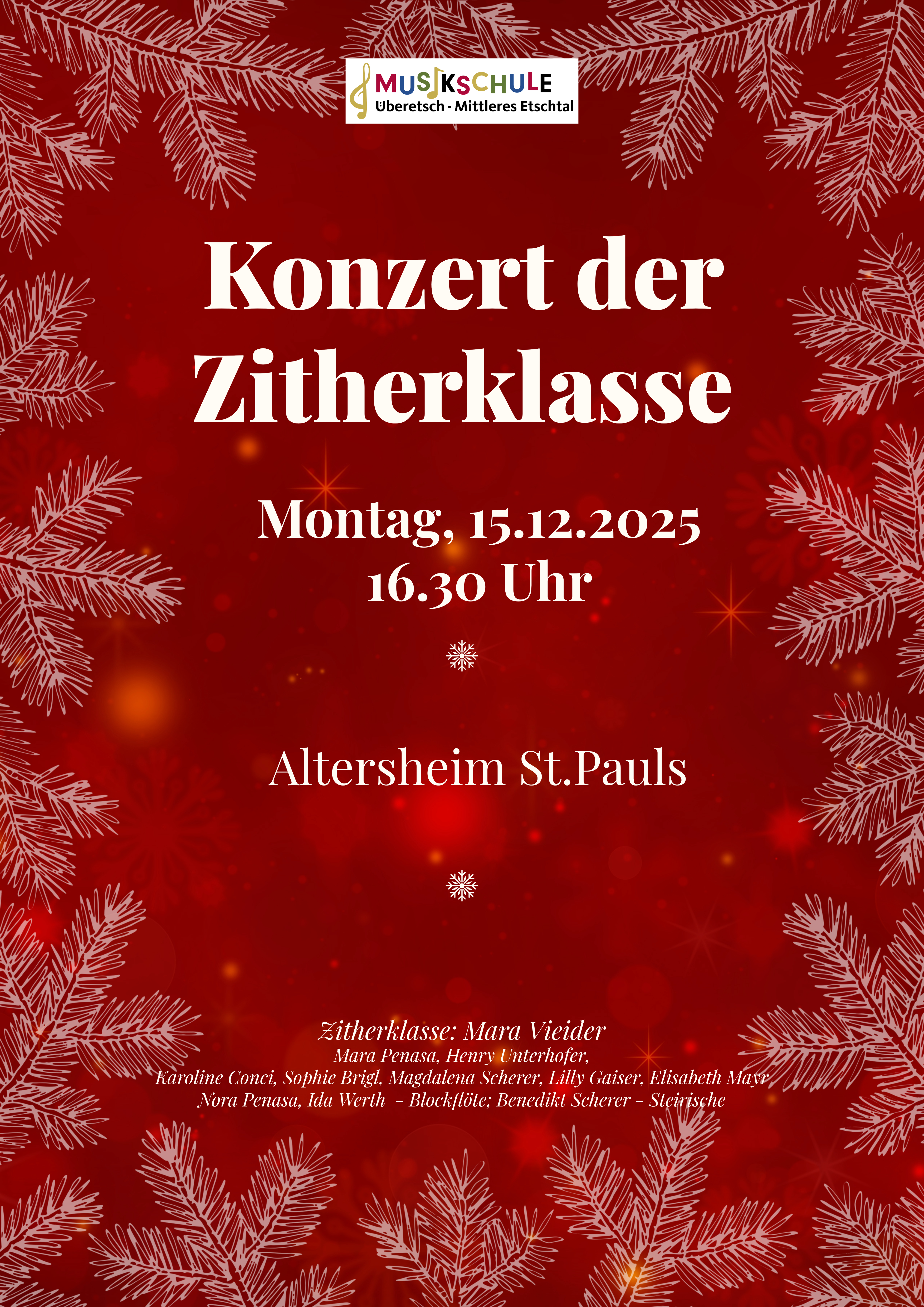 Die Zitherklasse von Mara Vieider lädt alle recht herzlich am 15.12.2025 um 16:30 Uhr zum Klassenkonzert ins Altersheim von St.Pauls ein.